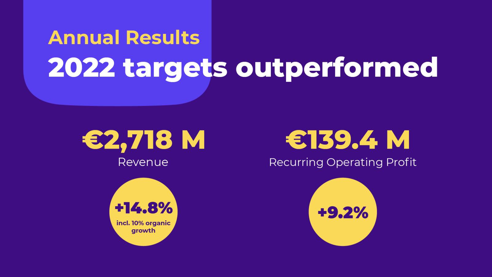 Recurring net profit4 increased1 by 20.7% to €95.5 million, resulting in recurring earnings per share6 of €0.53, above the target of €0.50 set for 2022.