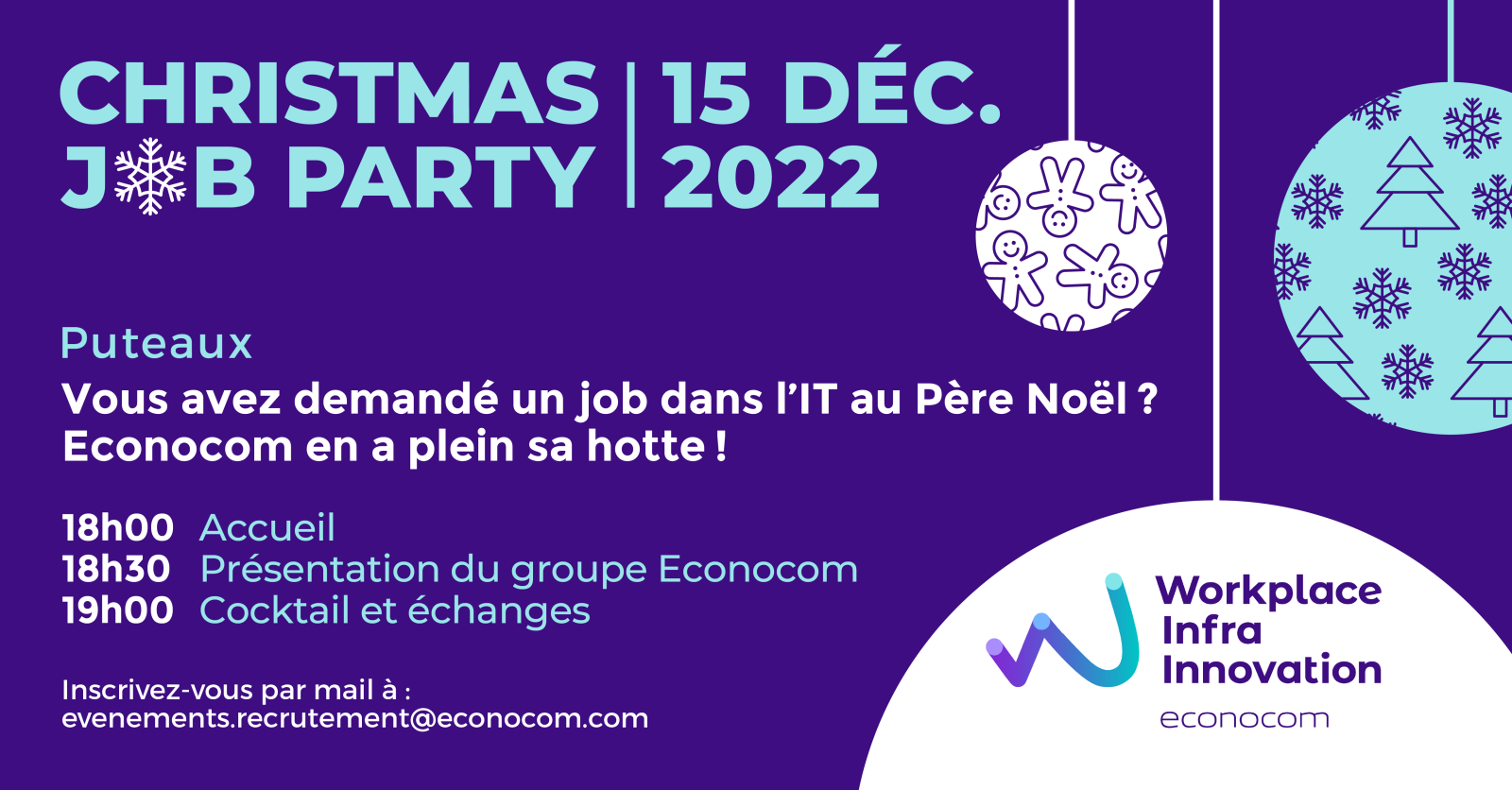 Vous souhaitez vous inscrire ? Envoyez votre CV à evenements.recrutement@econocom.com avant lundi 12 décembre 2022.