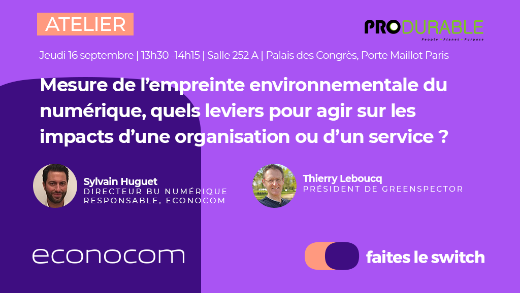 Econocom entrepreneur du numérique responsable et son partenaire Greenspector vous partageront leur expertise et leurs solutions, à travers plusieurs retours d’expérience réalisés auprès d’entreprises de divers secteurs, qu’ils accompagnent dans leur démarche Numérique Responsable. Venez participer à notre conférence animée par Sylvain HUGUET (Directeur BU Numérique Responsable Econocom) et Thierry LEBOUCQ (Président de Greenspector). Introduction par Véronique DI BENEDETTO, Vice présidente France d’Econocom.
