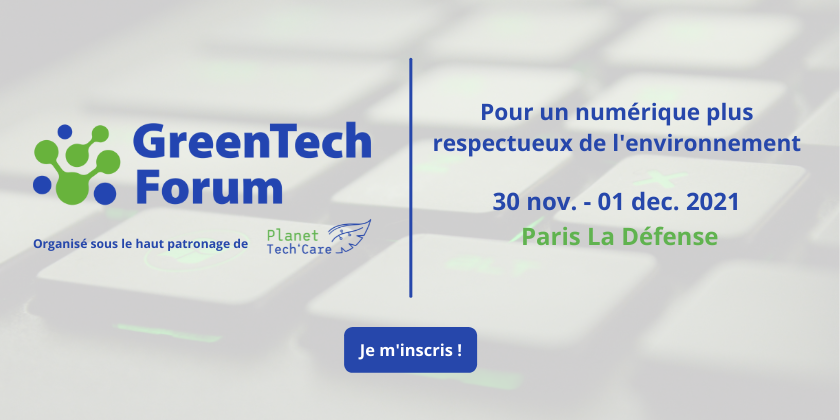 Du 30 novembre au 1er décembre aura lieu le GreenTech Forum, un salon organisé sous le haut patronage du Planet Tech’Care, destiné à promouvoir le numérique responsable, afin d’accompagner les organisations publiques et privées dans la réduction de leur impact environnemental.