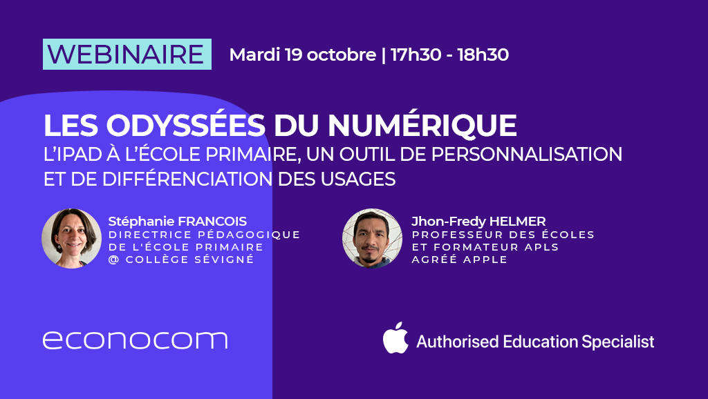 Econocom et l’équipe Apple Éducation vous invitent à participer à une série de webinaires mettant à l’honneur le numérique au service de l’apprentissage. Parce qu’un tel projet suscite de nombreuses interrogations, nous avons choisi de donner la parole chaque mois à un acteur engagé pour le numérique à l’école.