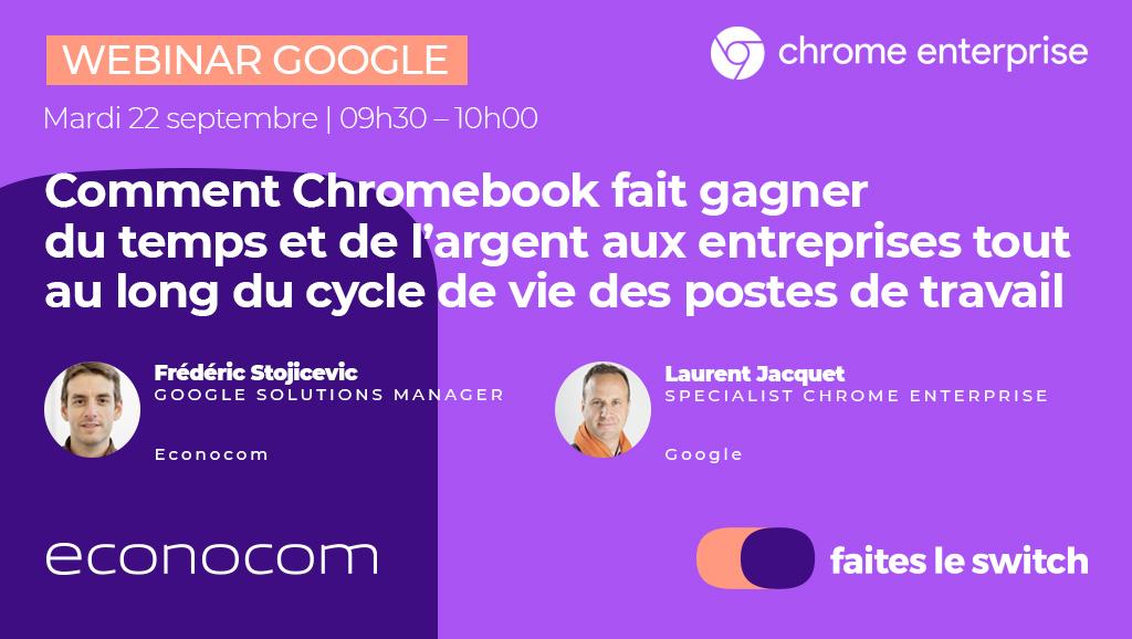 Webinar Google : Comment Chromebook fait gagner du temps et de l'argent aux entreprises tout au long du cycle de vie des postes de travail, qui aura lieu le mardi 22 septembre de 9h30 à 10h.